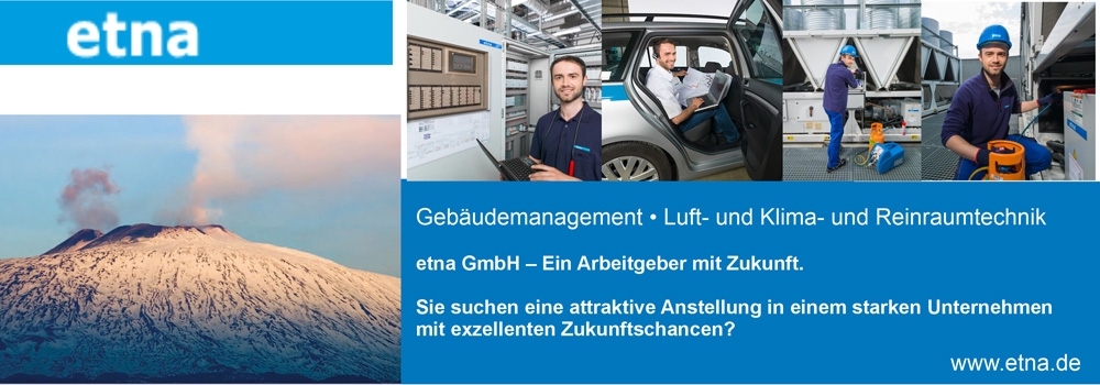 Sie suchen eine attraktive Anstellung in einem starken Unternehmen mit exzellenten Zukunftschancen? Fachwissen, Kundennähe und Teamwork gehören zu Ihren Schlüsselfertigkeiten? Die etna GmbH bietet Ihnen ein breitgefächertes Aufgabenspektrum mit besten Perspektiven. Es erwartet Sie ein modernes Unternehmen mit angenehmem Arbeitsumfeld und angemessener Entlohnung. Wir beschäftigen über 370 Mitarbeiter in unseren Kernbereichen Luft- und Klimatechnik, Reinraumtechnik, Gebäudemanagement und Schutztechnik, die anspruchsvolle Projekte vor allem in Deutschland, aber auch im Ausland realisieren.